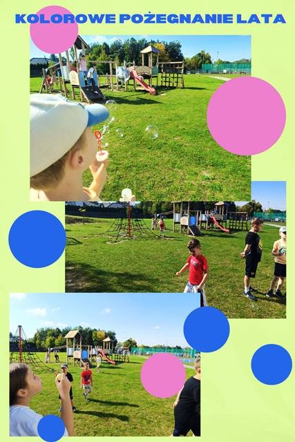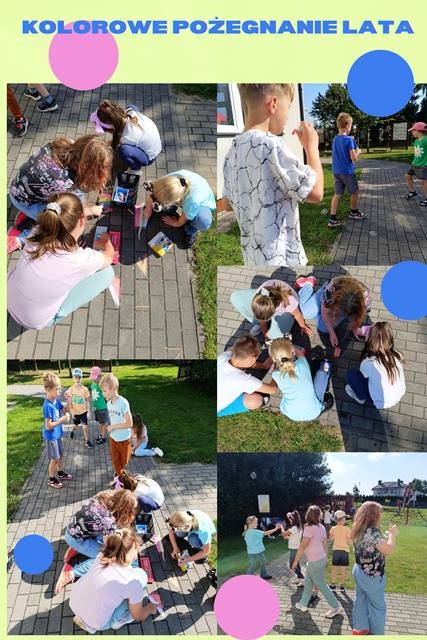 Korzystając z pięknej wrześniowej pogody, wybraliśmy się na świeże powietrze, by w kreatywny sposób pożegnać lato i z radością przywitać nadchodzącą jesień. Dużo radości wśród dzieci wywołało puszczanie kolorowych baniek mydlanych, ruchowe zabawy zespołowe oraz zdobienie chodnika pięknymi rysunkami inspirowanymi tematyką zajęć.
