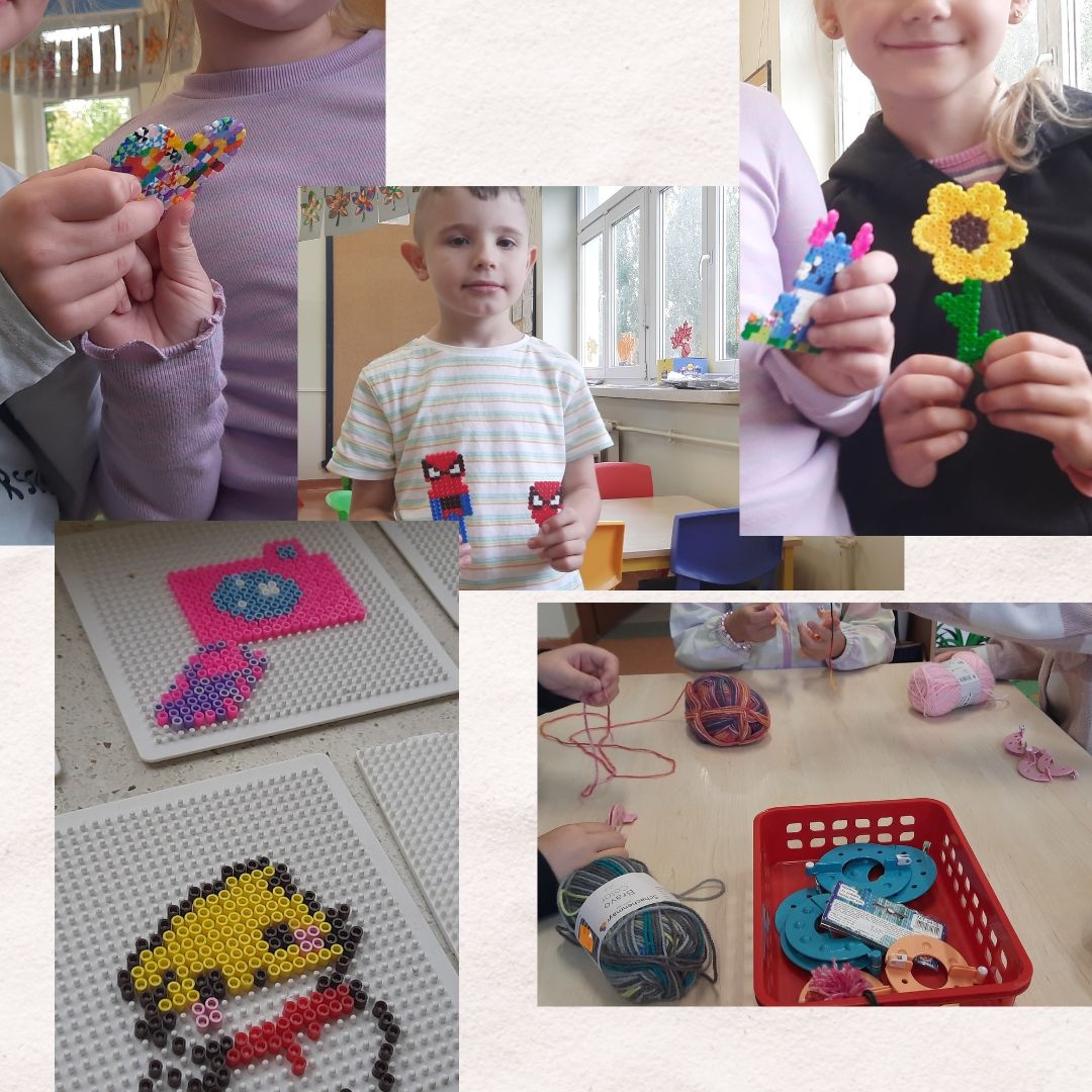 Wrzesień w świetlicy szkolnej upłynął pod znakiem twórczej zabawy i rozwijania zdolności manualnych. Uczniowie mieli okazję uczestniczyć w różnorodnych zajęciach plastycznych, które nie tylko pobudziły ich wyobraźnię, ale też pozwoliły miło i aktywnie spędzić czas po lekcjach. Jednym z ulubionych zajęć było robienie pomponików z włóczki. Dzieci samodzielnie dobierały kolory i tworzyły miękkie, puszyste ozdoby, które stały się dekoracją sali oraz drobnym upominkiem dla kolegów i koleżanek. Praca z włóczką rozwijała cierpliwość, precyzję i zręczność, a przede wszystkim przyniosła wiele radości. Równie dużym zainteresowaniem cieszyły się zajęcia z tworzenia wzorów z koralików. Uczniowie układali kolorowe mozaiki, serduszka, zwierzątka i inne wzory, wykazując się niezwykłą pomysłowością. Takie zajęcia nie tylko ćwiczą motorykę małą i koncentrację, ale także uczą planowania oraz wytrwałości w dążeniu do celu.